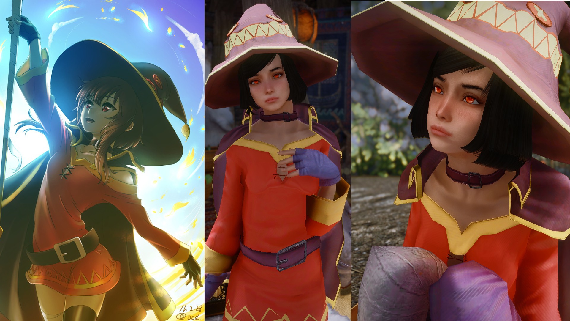 Мэгумин, архимаг из расы багровых демонов и первая кто присоединилась к группе Казумы Сато, в аниме “Богиня благословляет этот замечательный мир”. Так как она может использовать единственную высокоуровневую магию «Взрыв» и то раз в сутки, её выгнали из Коллегии Винтерхолда. Любит магию огня и ненавидит другие виды заклинаний. Можно найти в Данстаре.
