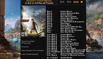Трейнер для Assassin’s Creed Odyssey версии 1.3.0 с 26 возможностями. Распакуйте содержимое архива, запустите трейнер и затем игру. Во время