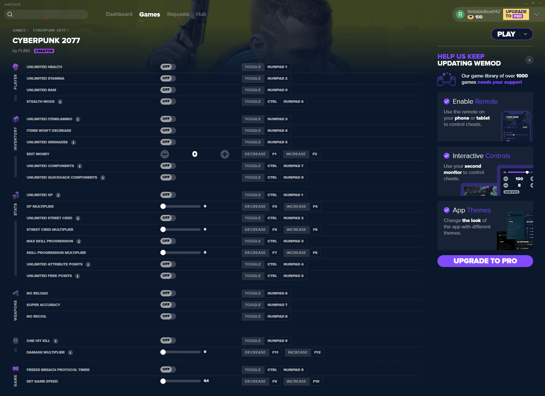 Трейнер для Cyberpunk 2077, созданный FLiNG, содержит ваши основные функции, такие как бесконечное здоровье, боеприпасы, сверхточность и т.д. Автоматическое обновление трейнера до актуальной версии игры, доступна через WeMod.