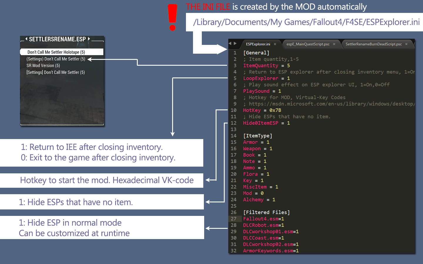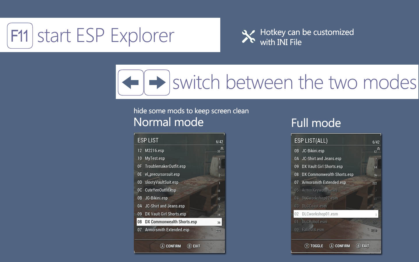 - В Fallout 4 добавится возможность вызова списка всех установленных модов прямо в игре (вызов клавишей F11 по умолчанию или модифицированное сочетание клавиш Shift + Z). Для клавиатуры AZERTY установите в файле ESPExplorer.ini в строчке AZERTY = 1, это изменит опциональный вызов списка модов с помощью горячих клавиш Shift + Z на Shift + W.