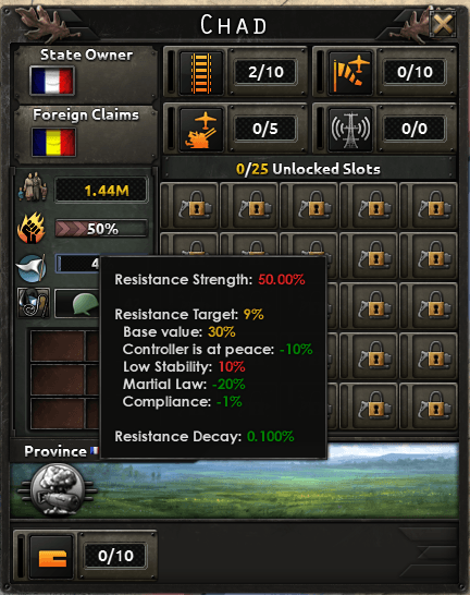 Старая система сопротивления довольно проста. Каждая оккупированная область имела требования для подавления.