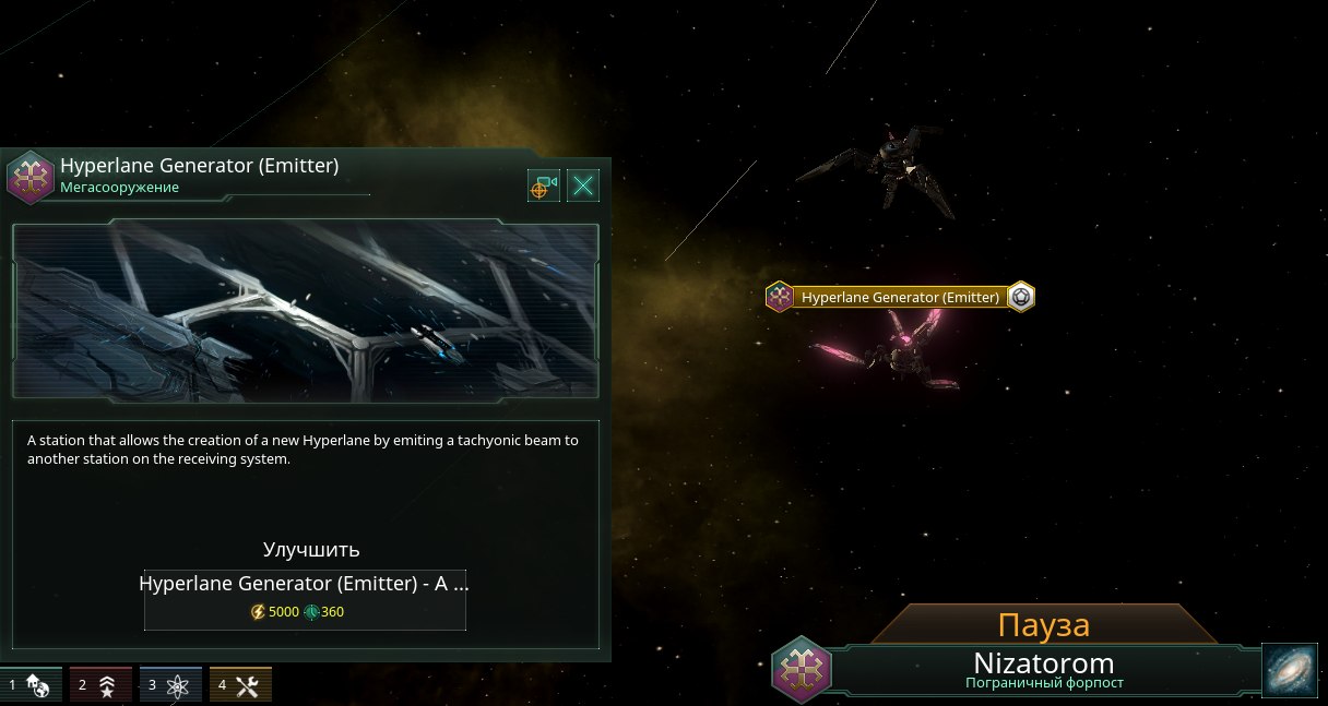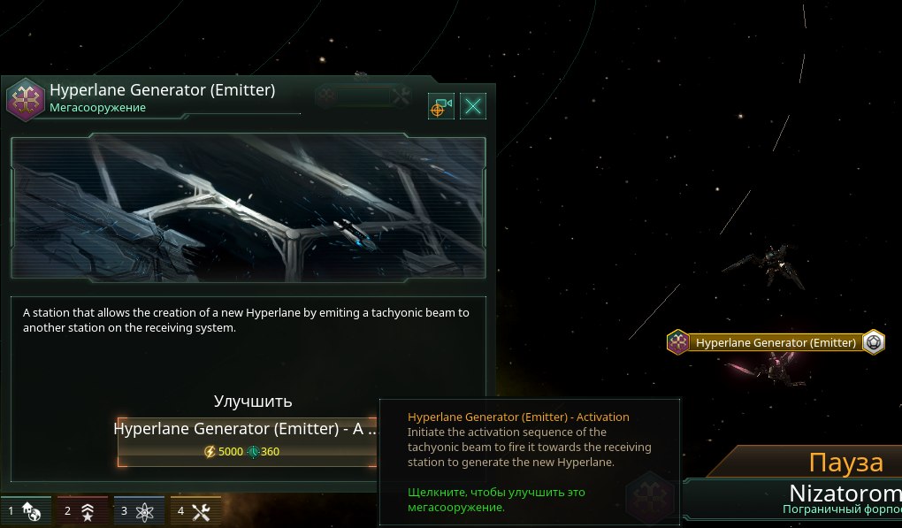 После того, как вы исследовали Hyperlane Generation, вам нужно построить мегаструктуры. Они могут быть построены только в пределах границ вашей Империи, и в них может быть только один из них.