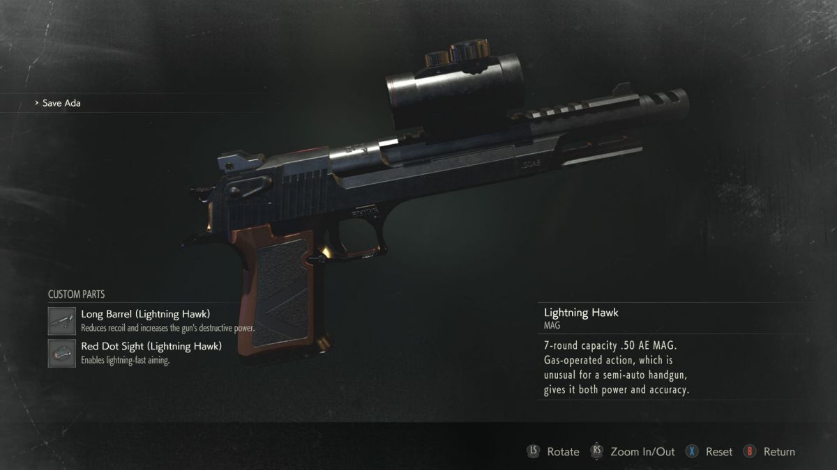Легендарный магнум Леона – “Громовой Ястреб”! Этот полуавтоматический пистолет способен косить зомби как траву, благодаря своему высокому урону.