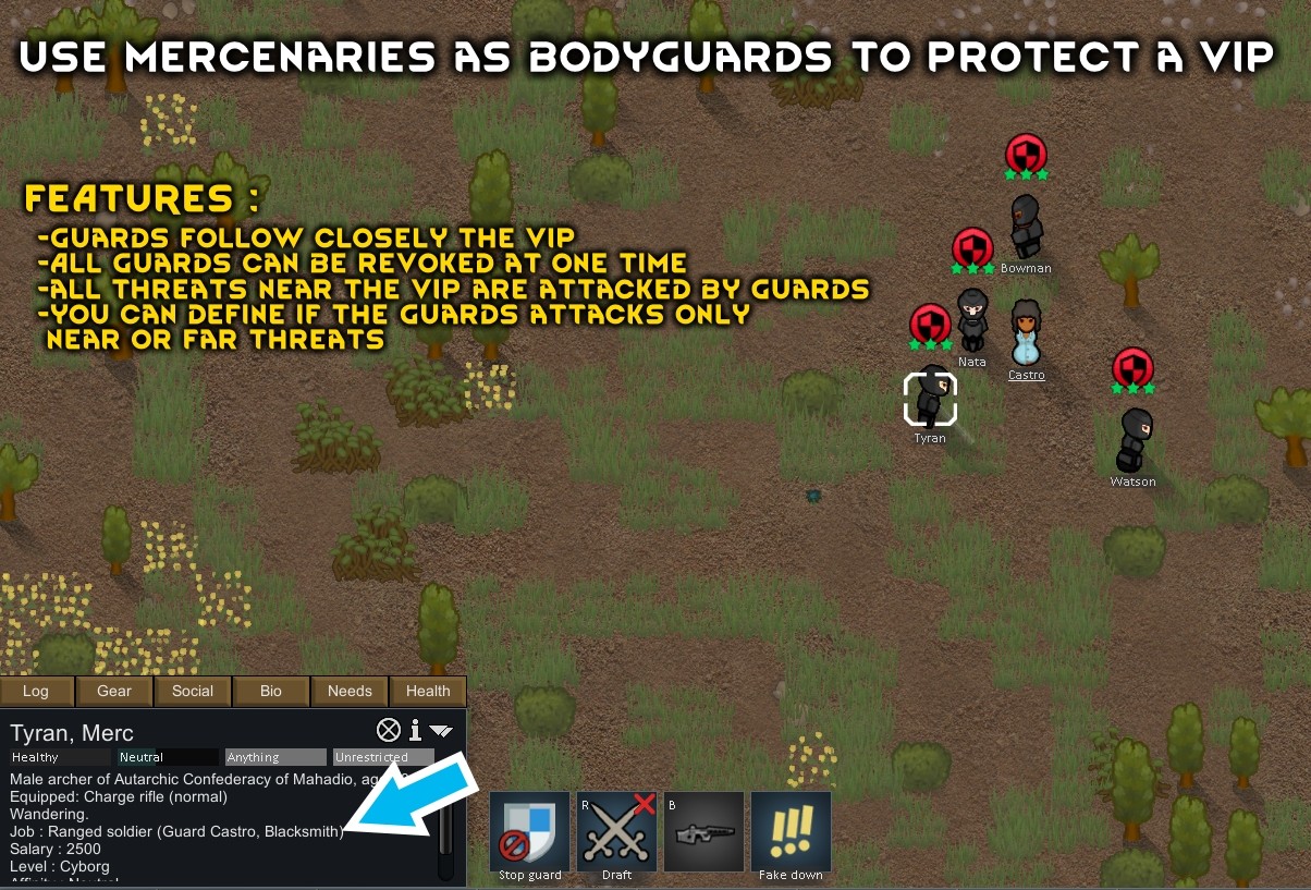 Данный мод дает возможность через консоль связи нанимать наемников через консоль связи и использовать их в качестве телохранителей. Наемники находятся под вашим контролем (как и другие колонисты) на протяжении всего контракта. Контракты наемников не ограничиваются солдатами, вы также можете нанять рабочих (художников, фермеров, ученых, дипломатов, строителей …).