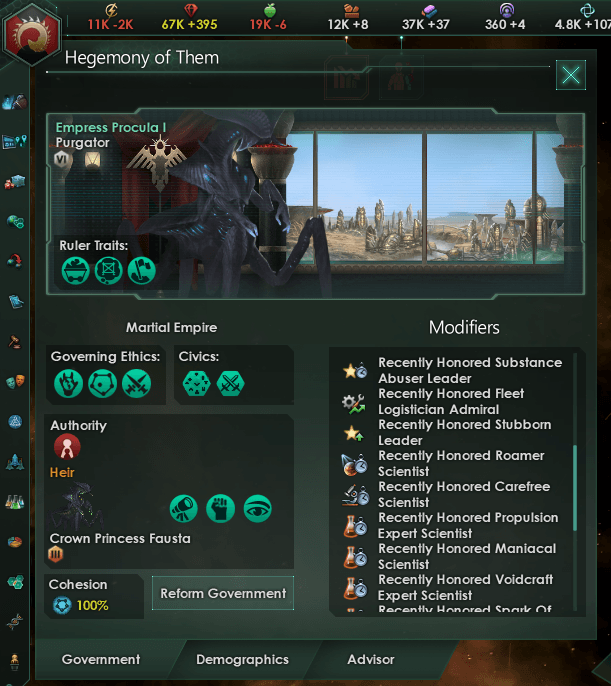 Honorifics основаны на вашей этике и могут быть отредактированы в файле локализации. Переименование и бонусы могут быть включены или выключены в указе опций.