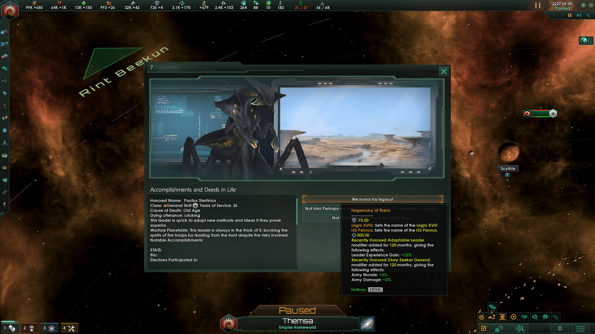- Почтите их ценой влияния, которое дает единство, основанное на навыке, чертах и достижениях лидера. В честь павшего лидера назовут: систему, планету, армию, корабль и т.д. В зависимости от класса лидера.